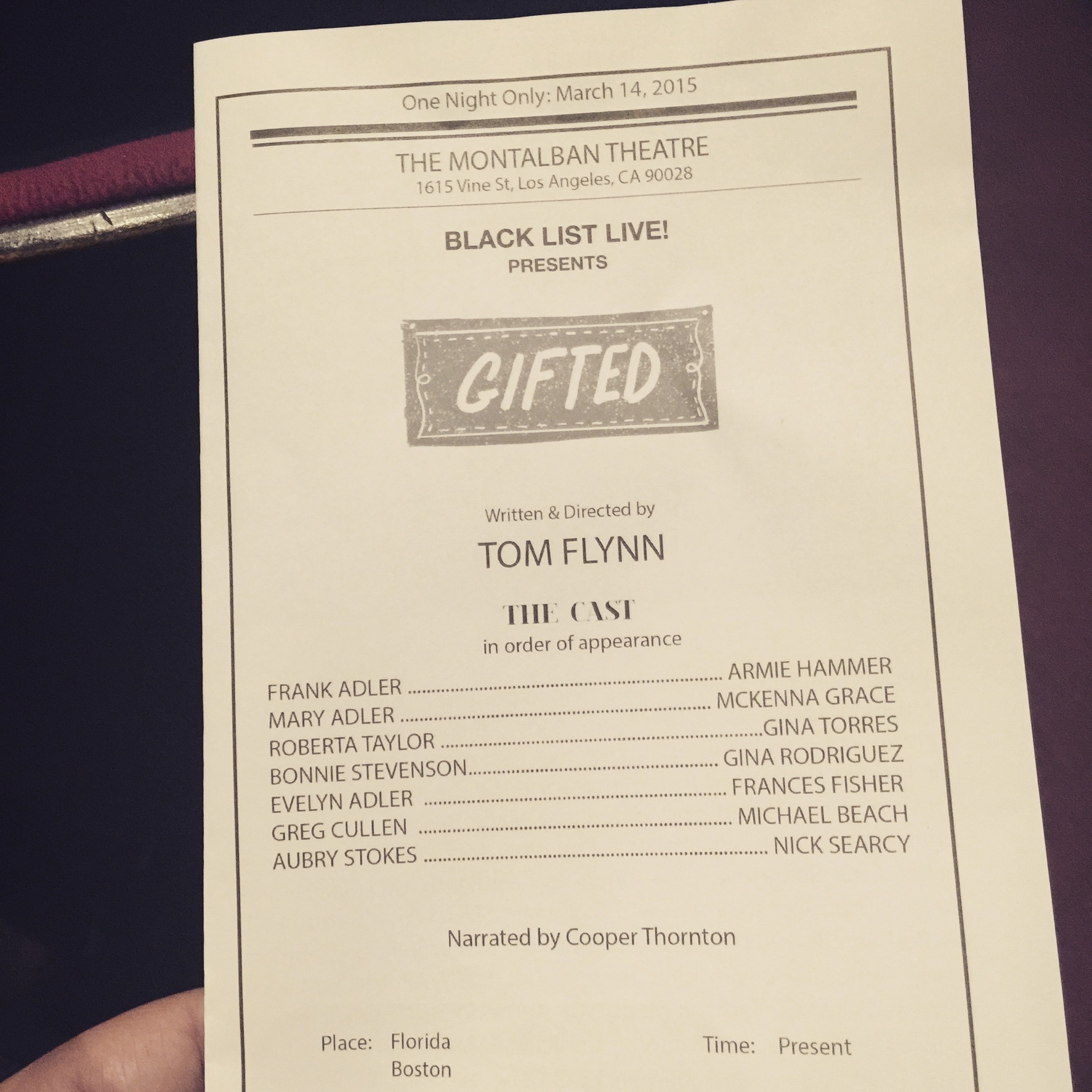 Two years ago, I had the opportunity to attend a staged table reading of Gifted with Armie Hammer (from the box office movies The Man From U.N.C.L.E. and The Social Network) and Gina Rodriguez (from Jane the Virgin) as the leads. Just this year, that screenplay was finally released in the theatres, starring Chris Evans (Captain America himself) and Saturday Night Live alum Jenny Slate.