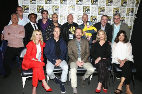 Breaking Bad 10th Anniversary: Top row L-R: Patrick Fabian, AMC’s Charlie Collier, Giancarlo Esposito, RJ Mitte, Michael Mando, Dean Norris, Aaron Paul, Vince Gilligan, and Peter Gould. Bottom row L-R: Rhea Seehorn, Bob Odenkirk, Bryan Cranston, Anna Gunn, and Betsy Brandt. [Photo Credit: Jesse Grant/Getty Images for AMC]